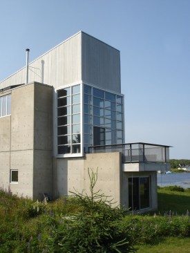 The modest house is a 12 foot wide, 110 foot long wall playing a didactic role within both the natural and cultural landscapes. It sits on a four acre field surrounded by the sea on three sides: east to a domesticated fishing cove, west to the nearby wild, open ocean, and south to the immediate shore of a bay. Its ‘rough-and-ready’ wrapper is in keeping with the dog-patch-like cultural landscape context. The exterior skin is standard, industrial, corrugated galvalume. The top-of-concrete line of the foundation is raised, expressing the relatively high cost of getting out of the ground in cold climates and forming a horizontal datum against the opposing slopes of land and roof. A heavy, concrete stair bump is a protective gesture against the prevailing westerly winds coming off of the sea.