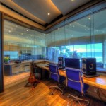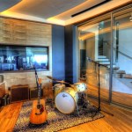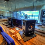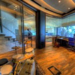 While its view is an irrefutable “eye catcher,” the Huber Music Room is a serious working studio, constructed with complete room-within-room isolation. Recording and mixing take place ‘in the box’, using Apple’s Logic Software. The room is outfitted with Barefoot Micromain 27 close-field speakers and a pair of soffit-mounted FBT 12MA PA speakers. “We’ve been able to pump the volume up to twelve with a high comfort level within the studio and, no sound leakage to the rest of the house,” Huber says. “And, the isolation works both ways: zero family related commotion intrudes while we’re recording.”