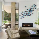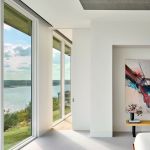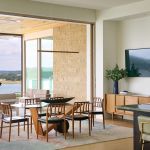 The new build is a 6,000 SF Hill Country contemporary with long low buildings that align the bluff overlooking Lake Travis with a western view. “Our concept was to develop a long, one room deep plan wrapping the infinity pool with views from every room of the house,” says James LaRue, LaRue Architects. “We incorporated wall to wall windows throughout so every room has a connection to the lake views, pool, courtyards, and outdoor living spaces.”