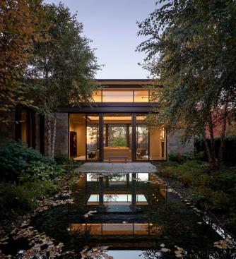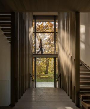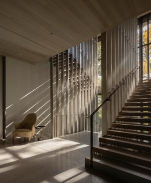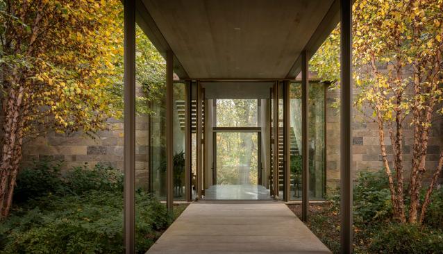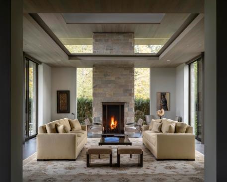 Perched high on a hill, this country house in Westchester, New York overlooks the family’s property, wooded hills, and neighboring reservoirs. Framed around views of the fourteen-acre site, the design of this weekend home is based on classic proportions while incorporating modern elements suitable to its rural East Coast setting. Stone chimneys and fireplaces are juxtaposed with modern materials such as steel and copper while a formal entry sequence through a covered courtyard opens to a suspended, triple-height steel staircase. This integration of tradition and modernity lends a stately balance to the home, which is presented as an elegant object surrounded by expansive lawns.