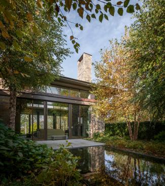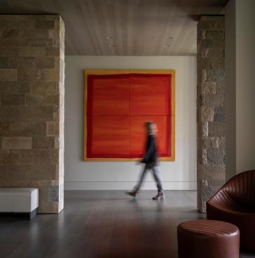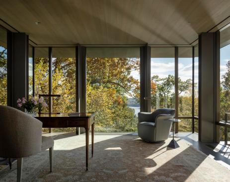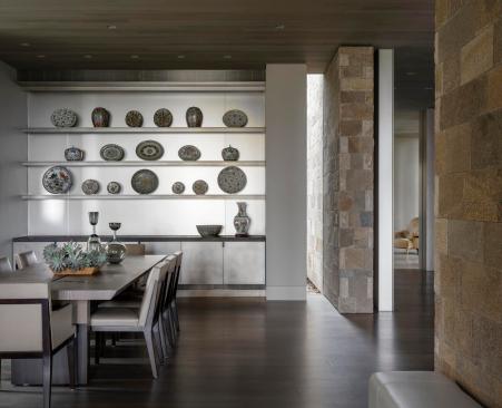 The residence is organized into two levels and a basement, with several outdoor terraces extending off the ground level rooms. Upon entering the home, a long promenade corridor extends in either direction, housing works from the owners’ collections of art and Asian porcelain. Every vista ends in a framed view of nature subtly recalling the floral themes that decorate the porcelains. All views are complemented by the classic proportions of the home. A formal living room on the main level stands almost as a pavilion unto itself, with sliding window walls on both sides, and a double soffit ceiling with clerestory windows that accentuate the lofty verticality of the space. An informal family room on the western prow of the home is capped by the master suite above, yielding breathtaking views from both rooms all the way down the nearby reservoir. Auxiliary spaces include two guest rooms on the main level and three on the floor above, along with an upper-level exercise room, art studio and office.