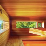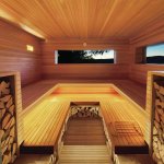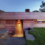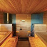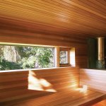 The 337-square-foot space is modeled on traditional Finnish saunas, with a cedar-clad interior heated by a wood-burning stove beneath an earthen roof planted with local wild grasses. An ipe rainscreen wraps the building, which is trimmed with unlacquered bronze at the overhang and window casings. A sunken entrance courtyard—which doubles as an outdoor shower—is paved in bluestone that was harvested on site. Inside, cedar slats form the benches and floor deck. Tongue-and-groove planks wrap around the interior walls and overhead, and two large windows frame the riverfront views. Soapstone floor slabs in the changing rooms double as heat shields around the electric and wood-burning stoves.