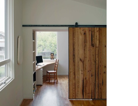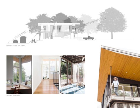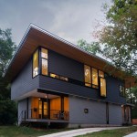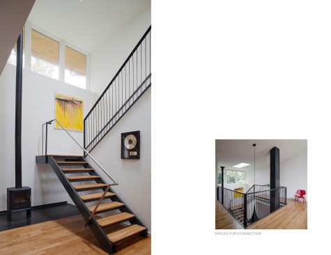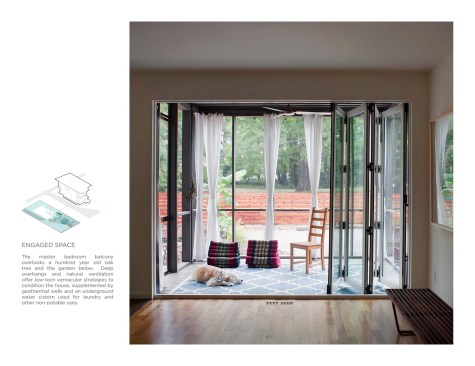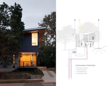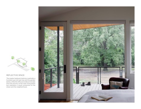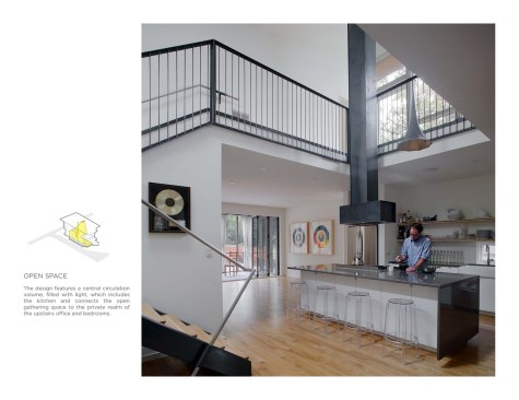 The house directly reflects the personality of the young couple that lives there: open, engaged, and reflective. His love of cooking and entertaining inspired a central, open, light-filled kitchen with dining space that can expand out to a connecting porch. Their shared interest in gardening led to a water catchment system. And her need for reflection suggested a quiet writing nook. Like its homeowners, the house aims to educate strangers and friends alike in both environmental stewardship and thoughtful design.