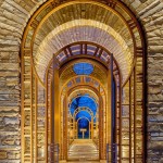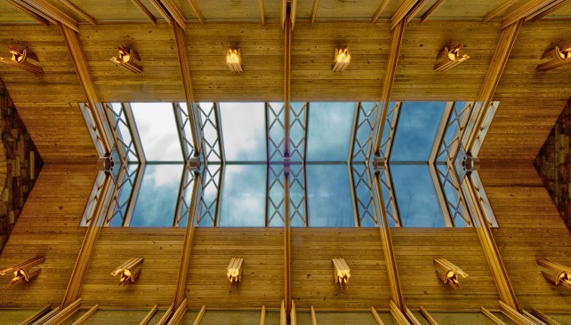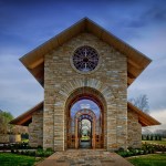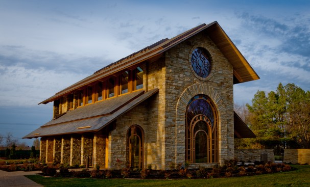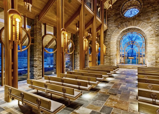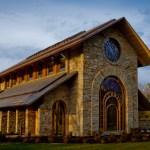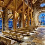 The stone in the arches and walls comes from local quarries in Northwest Arkansas as well as Eastern Oklahoma. The chapel is 3,000 square feet and the height at the ridge is 43 feet above the ground. The chapel can accommodate up to 135 people. The stone of the chapel speaks to the chapel’s permanence and strength. The wood, protected by the slate roof, shows depth and life though its grain.