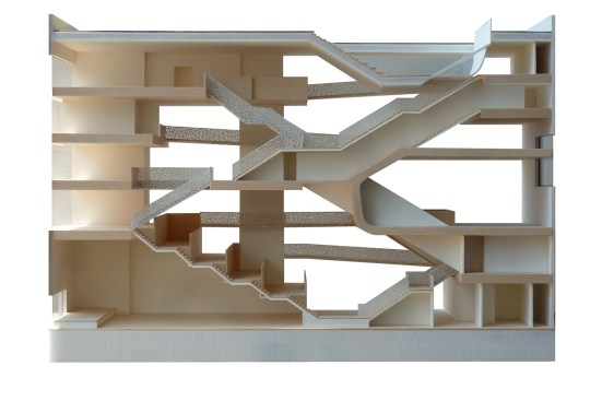 The exterior is formed of cast-in-place concrete coated with aluminum paint, giving the building an alluring sparkle. To the east of the slender structure sits a “reading garden” surrounded by Ginkgo trees, which mediates movement between the literary sanctuary of the library and the hubbub of Queens. Inside, the stacks flow continuously upward via a series of stairs that switch back from mezzanine to mezzanine. The stairs are interspersed with small reading areas lined in acoustic bamboo—and lead to a rooftop café and reading space. The flow is articulated on the façade by a series of glazed cuts in the concrete—one each for the children’s, teens’, and adult’s book sections. The cuts allow passersby to watch people moving within the library, but they also offer stunning views back to the city, across the East River. —Clay Risen