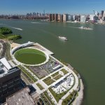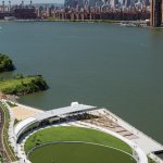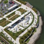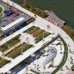 Central to the project is a multi-use oval, which serves as a landscaped play field for most of the year, but can also serve as an overflow area for storm surge on the flood-prone site. Adjacent to the oval, a curved pavilion with a bent-steel canopy houses Parks Department offices as well as restrooms and a café. The structure is designed to withstand uplift in case of flooding, and its roof directs rainwater into bioswales that manage stormwater onsite.