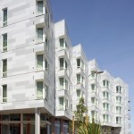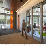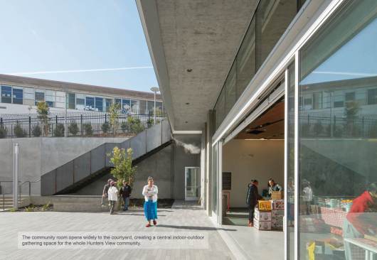The serrated façade of the five-story-tall Block 10 building responds dramatically to its site at a 90-degree bend in Fairfax Avenue on the highest point in the entire Hunters View development. Colorful glazed panels clad the building’s saw-toothed bays and reflect the building’s role as a vibrant neighborhood hub.