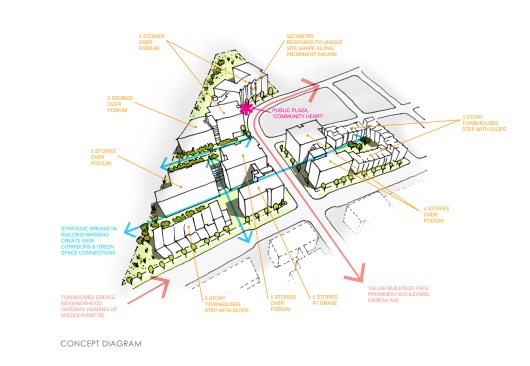 Slightly below Block 10, on a flat part of the site, two five-story apartment buildings frame Fairfax Avenue on Blocks 7 and 11. On the north and south ends of these blocks, the topography drops off and one- to four-bedroom townhomes organized around landscaped central courtyards step down the hill. A diversity of scale and texture was created by dividing the design authorship of different structures between the two joint-venture architecture firms.