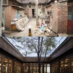 The inner courtyard was restored following the original layout of the space. The wood filigree panels that lined the inner courtyard have been stripped of their stains and returned to their original luster, with replacement sections reproduced with the same size and motif. The pattern and arrangement of the wooden door and window frames has also been retained, forming an elevation that is open.