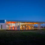 Informed by the futuristic look of the solar farm itself, the architecture is sleek and sculptural, even stealthy, when viewed from the 70-mile-an-hour Interstate highway. The glass-enclosed information space, the focus of the Center, offers an almost 360-degree vista of the surrounding solar panels. Oriented towards I-40, the colorful LED-lit energy exhibit becomes a prominent design element visible from the highway. Angled walls, a subtle gesture directed toward the adjacent Interstate, and cantilevered roof overhangs shade the glass walls.