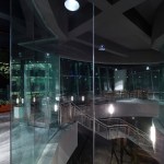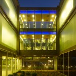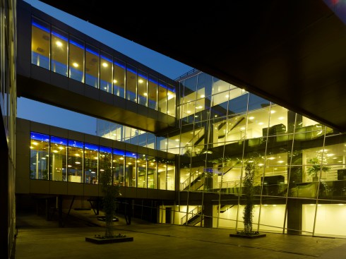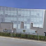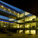 The entrance façade and the northern facade were designed clearly more massive than the other façades creating a strong contrast. The southwestern façade on the other hand, has a unique character on its own because of the needs deriving from the functions located on that side of the building. Here, a more controlled glass façade with a dotted texture was chosen in order to filter the effects of the sunlight to a certain extent.