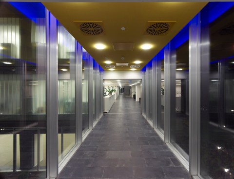 The main entrance was to be linked to the road level by a bridge is conceived as a separate steel frame unit between the blocks A and B. This simplified the orientation of the visitors and the employees. On the other hand, the secondary building entrance and the entrance to the covered parking garage were to be located at the southern façade of block C which is settled on the lower level of the site.