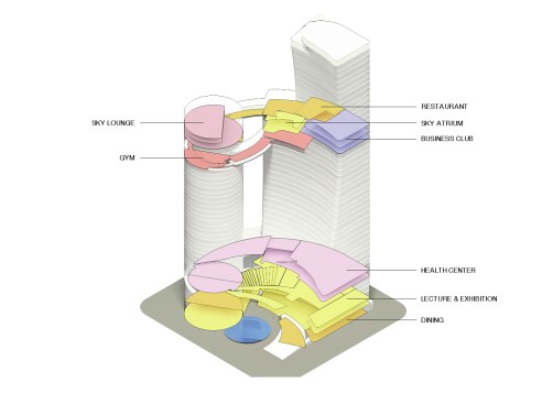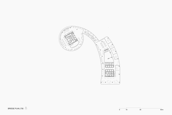 Body A, a 150 M residential tower, is the Living element. Body B, a 200 M tower with offices, labs, and public reception spaces, is the Working element. Four green bridges act as carbon bonds, joining the towers. The two upper bridges contain the health program, joining a health and nutrition circuit with cafes, a gym, and a swimming pool. The two lower bridges join to form public outreach spaces, a clinic, galleries, and meeting spaces. The iCarbonX Clinic is the central element that anchors the Living and Working towers, supporting ICX’s mission to apply science to daily life.