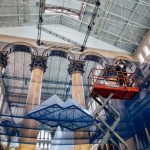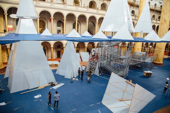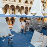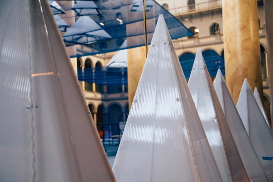 ICEBERGS will feature installation elements in a variety of sizes and built of re-usable construction materials such as scaffolding and polycarbonate paneling, a material commonly used in building greenhouses. A “water line” suspended 20 feet high will bisect the vertical space, allowing panoramic views from high above the ocean surface and down below among the towering bergs. The tallest “bergy bit,” at 56 feet, will reach above the waterline to the third story balcony of the Museum. ICEBERGS will occupy a total area of 12,540 square feet.