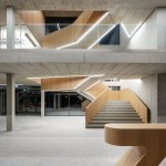 The furniture is equipped with wheels, making it adaptable to various, changing forms of individual and group work. Flex complements the overall geometry of the building’s structure with its diagonal elements and clear-cut design. The design’s language is communicated through large-scale wooden fixtures in the foyer and other areas, and reflected further in the rounded shapes of the movable desk-walls and mobile whiteboards. The choice of haptic, matte black surfaces, furthermore matches the wood and concrete elements present throughout the building.