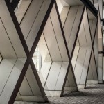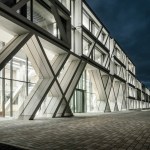 The project, which opened this fall, has certainly done that. On the outskirts of IGZ’s hometown, the new facility is a gleaming beacon, an office building with all the panache and sophistication of a big-city corporate headquarters but with a warm, rural soul. Composed of a glass envelope affixed to a concrete structural core, the rectangular volume is sheathed by a self-supporting wooden screen and graced with a surrounding exterior terrace and interior finishes made of smooth, gleaming granite. Altogether, the design reflects the JMH team’s interpretation of the traditional streetscape of Falkenberg. “We were looking at the old buildings in the town,” recalls Schneider, “and we kept seeing these houses with diagonal wooden members.” Half-timbered structures are commonplace throughout Bavaria, and the irregular truss system that wraps around the new IGZ building is a nod to that centuries-old tradition.