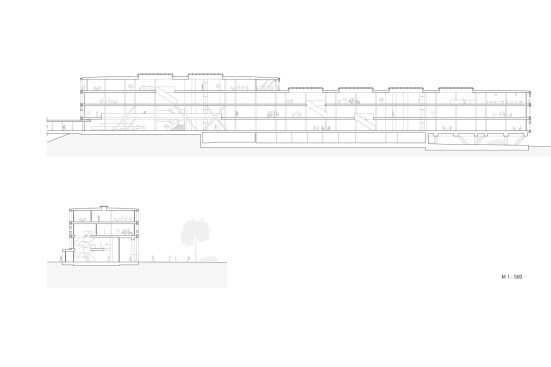 The building was planned as a skeleton structure of reinforced concrete. All load-bearing and bracing components are made of wood and exposed concrete, creating a visual blueprint of IGZ’s company headquarters. The partition walls and built-in furniture are non-load-bearing and made entirely of wood and glass. Composed of various elements, the construction creates a light and warm atmosphere, while remaining highly flexible to future alterations. The grey glazed wood façade further develops and reinterprets the materiality of the company’s existing buildings.