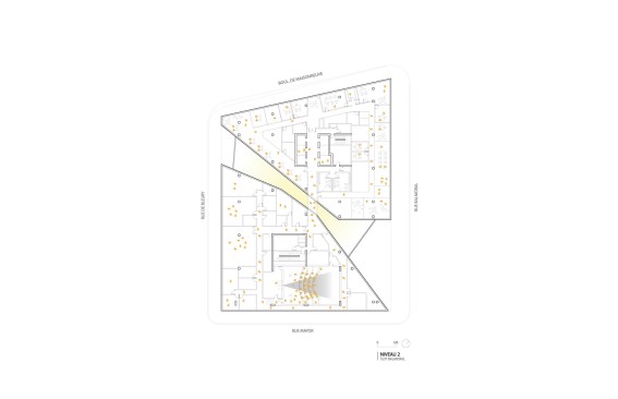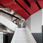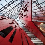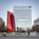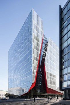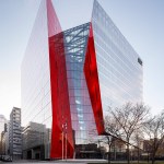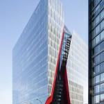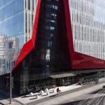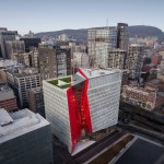 A new addition to downtown Montreal’s Quartier des Spectacles, the Îlot Balmoral adds a dynamic silhouette to the evolving skyline of Quebec’s largest city. Rising 13 stories, the 299,775-square-foot mixed-use commercial tower houses the National Film Board of Canada and the NAD School at the Université du Québec at Chicoutimi. Local architecture firm Provencher_Roy designed the tower around the existing pedestrian route on the building’s block-wide site, a diagonal path that connects the Place-des-Arts metro station and the Place des Festivals. A central atrium over this thoroughfare divides the new crystalline building into two sun-filled masses, marked on the otherwise all-white fritted glass curtain wall by a red façade.