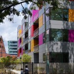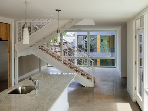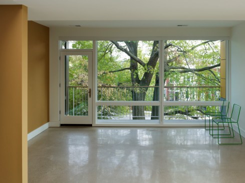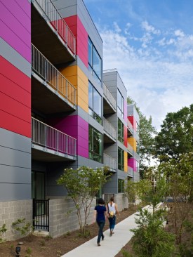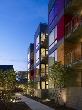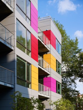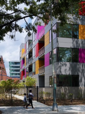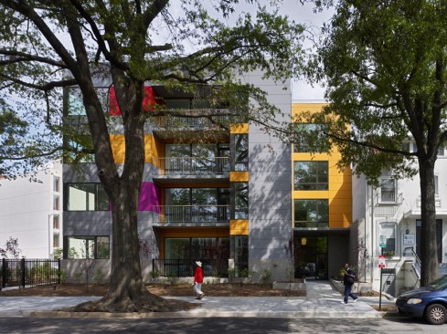 The bold exterior colors reflect the vibrant culture of the neighborhood. The long west façade engages the street and speaks fondly to the award-winning Watha T. Daniel-Shaw Library, located diagonally from the site. However, while the exterior is bold, the interior is serene and calm. Large, spacious units with a modest palette lend a gallery-like feel to the space. Combining creativity with cues from the surrounding context resulted in a new model for urban living.