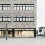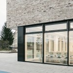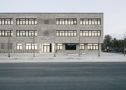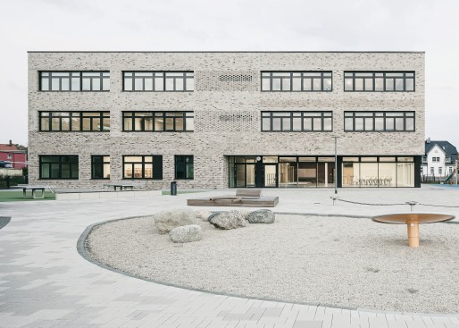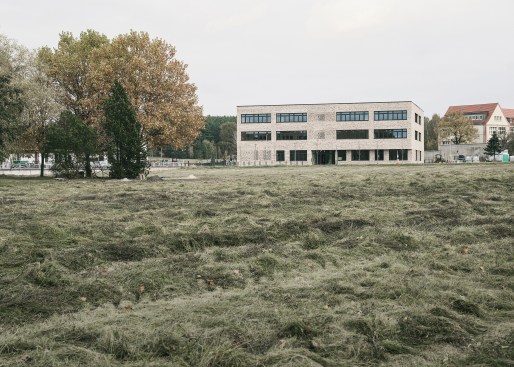 On the edge of the Lusatian town, the existing secondary school was extended by a building for primary education to create an inclusive school centre. It is a monolithic, three-storey building with a distinct volume, whose recesses on the ground-floor accentuate the entrance and school hall. These recesses and the materiality of the facade clad with coal-fired facing bricks create a regional reference to the former mining region. While a forecourt opens up towards the street, the multi-purpose room, which serves as a school hall and dining room for the entire school centre, overlooks the open landscape. On the two upper floors, the classrooms and group rooms are arranged around two atriums. The rooms can be used in different combinations, allowing the building to accommodate flexible forms of teaching, even outside in the green classroom and on detached learning islands.