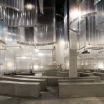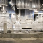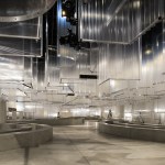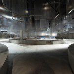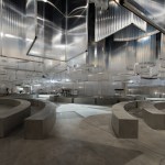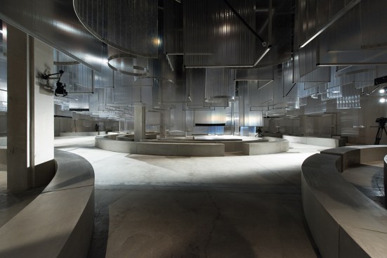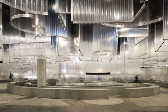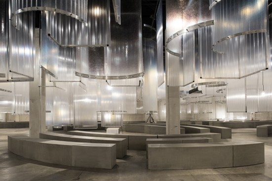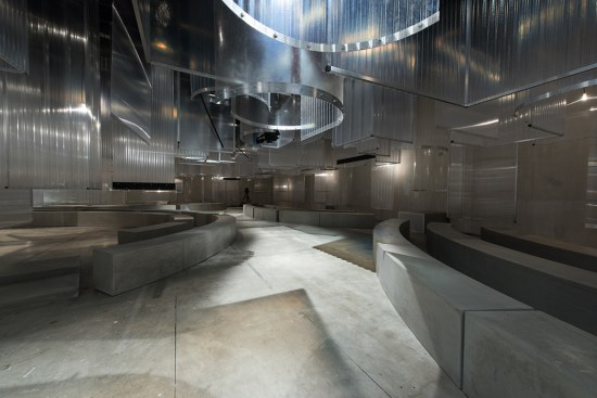 The fiberglass and polycarbonate stalactites manipulate the proportions and perspectives of the brutal and industrial