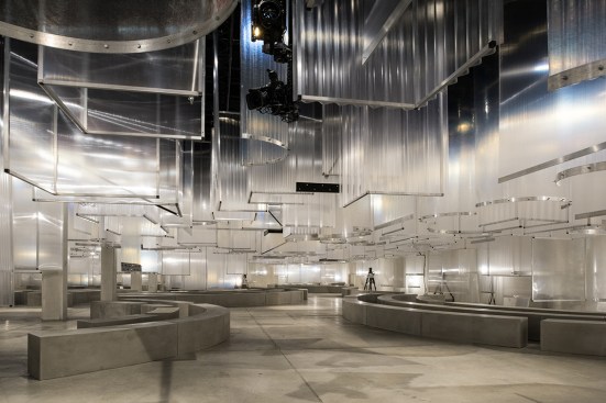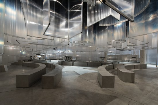the ceiling. Plastic sheets hang down acting as a virtual mold that defines the catwalk and seating areas, while the
