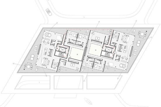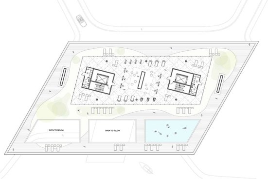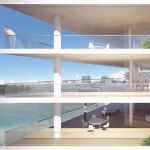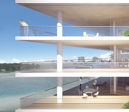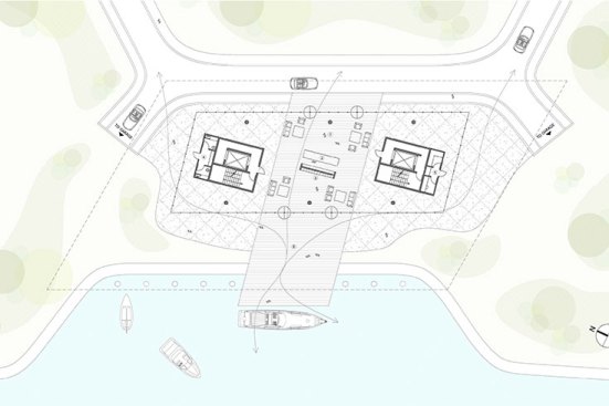 It is also raised 2’-0” above ground, so to guarantee natural ventilation to the underground parking. Modifying the coastal line of the bay along the property allows for us to bring the water in and allow for private docking right at the lobby level.