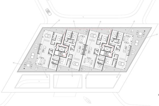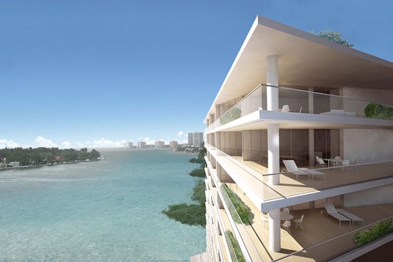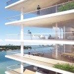 We orientated the building parallel to the perimeter of the allowed area of construction, to benefit from the Eastern & Western light/views. As well as, beneficial cross ventilation with the apartments. Each apartment has a terrace facing both ocean (east) and bay (west). The new tower generates from a platform suspended 15’-0” above ground level, which becomes the buildings garden, a large private terrace overlooking the bay. It is also where the gym and open air pool are located. Under the platform, the lobby at first floor is fully glazed, with the two “elevators/stairs’ cores floating within it, so to guarantee an extremely open space, and no visual barrier between interior and exterior.