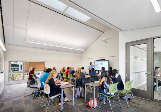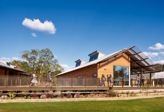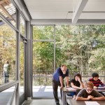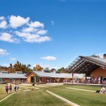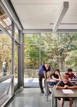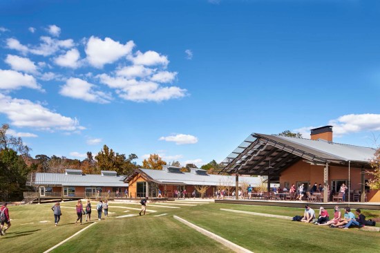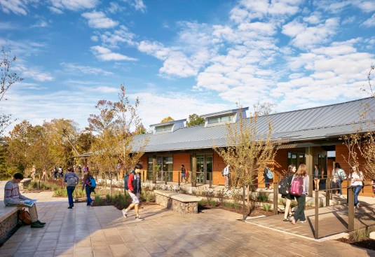 The 350-acre boarding and day school campus, originally planned by the Olmstead Brothers, was functional and serviceable but aging facilities were inhibiting the growth of educational programs and opportunities. This first phase of a comprehensive master plan includes new academic and administrative buildings and complementary landscapes that create a memorable, meaningful place. Porch ceilings and overhangs are crafted of wood and are natural frames of the surrounding environment. Roof monitors on the buildings provide daylighting to each classroom, while a storefront system and high-performance glazing afford views along the covered walkways and to the campus beyond. The project is targeting LEED Silver certification.