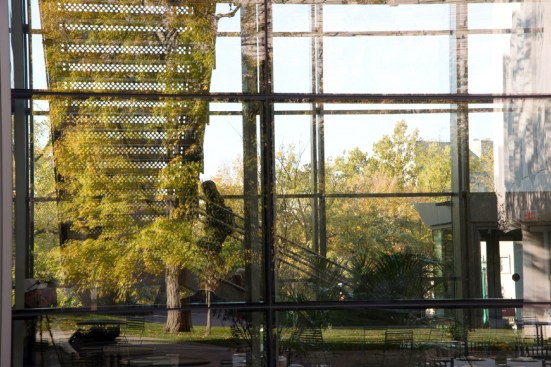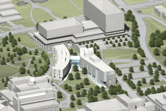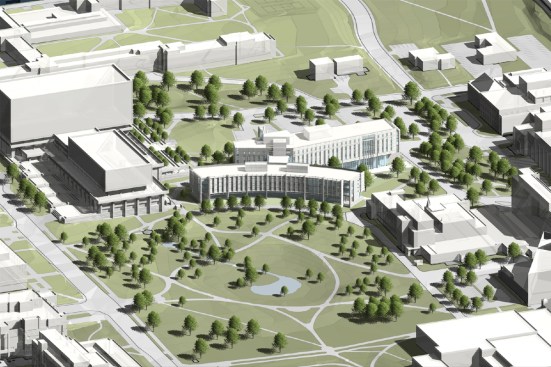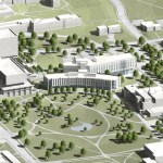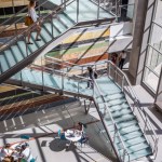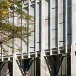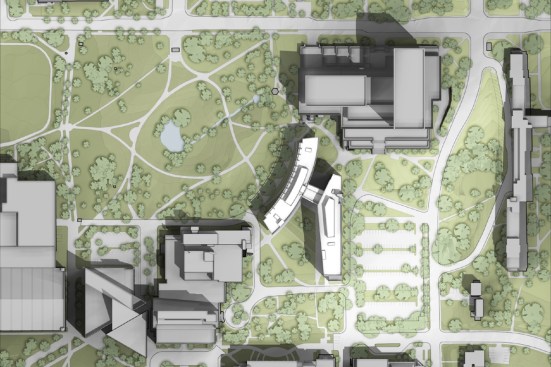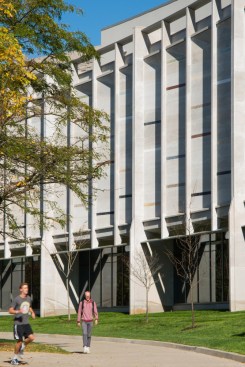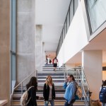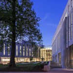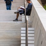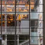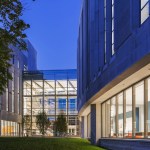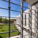 The new Global and International Studies Building defines an important cultural and academic crossroads at the heart of campus. Home to the new School of Global and International Studies and many of the language, literature and culture studies programs in IU’s College of Arts and Sciences, the new building provides flexible spaces for teaching and learning that extend beyond the classroom to foster collaboration and inter-disciplinary education. Integrated into the sloping topography at the eastern edge of the campus’s historic core, the design fuses building and landscape by framing a new terrace landscape as an extension of public gathering spaces within the building. Compositionally the building’s two wings respond to the unique geometry of the site —one set by the orthogonal grid of the surrounding campus context and one generated by the curvilinear geometry of the arboretum and former velodrome to the west. A three-story glass enclosed volume unifies the building and defines the intersection of movement to and through the building. This monumental gathering space celebrates the University’s longstanding commitment to international studies on campus. Sustainable design principles have informed the design with particular emphasis on the building’s solar orientation and the integration of daylight and views throughout the building. Locally quarried limestone on the building’s exterior continues the campus tradition with accents of vibrant colored stones from around the world making visual reference to the study of global cultures. This rich variety of materials and textures culminates in the interior with a three-story wall of international stones in the central atrium.