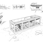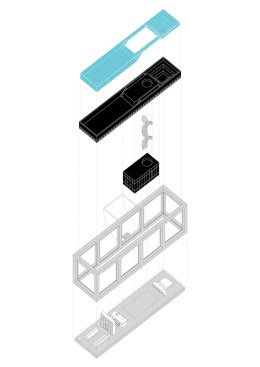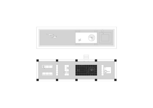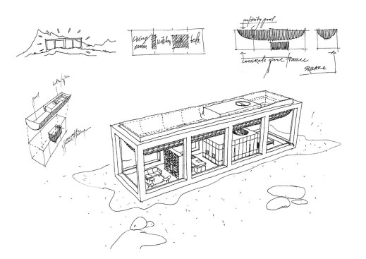 The building consists of three main elements: exterior concrete superstructure, black concrete infinity pool roof and a black box with a bathroom and a secret stair. The house is designed as one big open space, where living room, kitchen and bedroom are located. The interiors are subtle and have predominantly monochrome tones in order not to distract from the ever changing light and colors on the outside. Enclosed black volume of the bathroom contains a stair that leads to the 21m infinity pool on the roof. The heated pool is divided in two areas—swimming lane and resting bath, providing various recreational opportunities for the owners.
