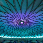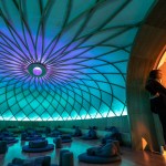 Upon entering the Dome, a bamboo entry “portal” envelopes the guests, creating a gradual transition into the controlled environment of light/ sound / air. Here one can leave the world outside, and focus on oneself, expanding mind and brain. The rings of LED light envelop the space, after one settles on the specifically designed meditation pads, the meditation starts, and the upper led ring dims to leave only the lower led ring [horizon] on as a focus point. The open oculus above symbolizes eternal space, and an opening of the mind. The lower ring reminds one of the horizon [think of the ocean, the desert] that induces a calm reflective state of mind.