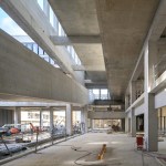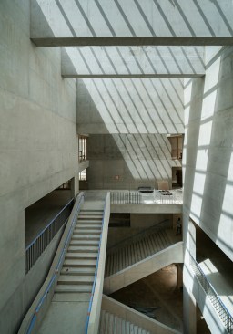 The form and singularity of the quadrangle and of the total block is held by the research offices, doctorates rooms, and directors offices which hover above a looser more fluid series of inside and outside spaces below.