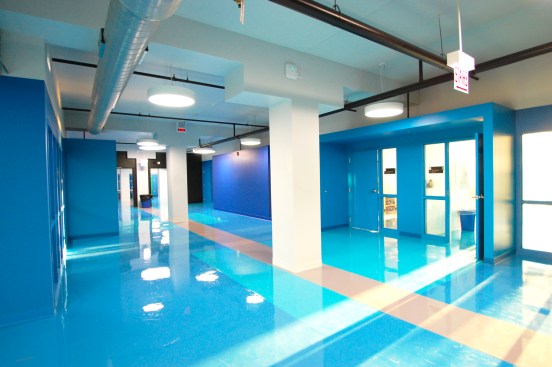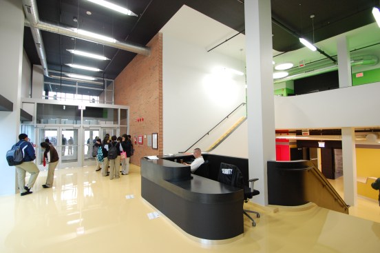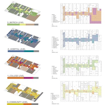 The programs, labs, and classrooms are broken down into four categories to fit within the four levels of the building, named as follows: Community, College, Hospital, and Biotech. Each of these categories were analyzed historically and contextually to provide the basis of the interior design. Through this analysis, a distinct color scheme, graphics and furniture were selected for each level. These themes are applied most prominently to the corridors to provide the students with a positive and energetic interaction space.