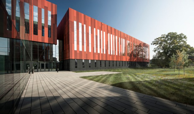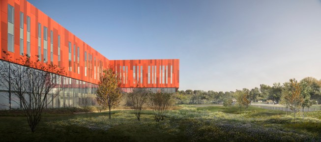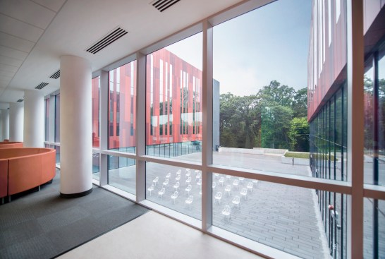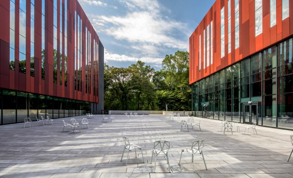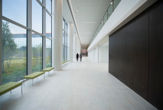 The design was intended to increase communication and information-sharing, breaking down silos and making employees feel that they were not enclosed in a bunker. To this end, glass is located wherever possible to broadcast natural light into the workplace, while remaining blast-resistant. A dining terrace outside of the cafeteria overlooks a green roof, and a 14,000 square-foot plaza with linear concrete pavers promotes a space for colleagues to meet with each other.