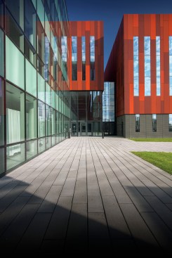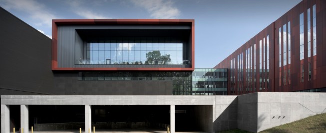 Understanding these challenges, LEO A DALY designed a renovation that unites the campus aesthetically and programmatically. The three existing buildings were reskinned with a “natural camouflage” scheme, and all on-grade parking was returned to native habitat. Stitching together the fabric of the campus, a new Z-shaped Centrum building maneuvers around two existing buildings and connects to a third through a multi-level elevated bridge. Envisioned as an employee hub, the Centrum contains a main-entry lobby, fitness facility, auditorium, and several floors of secure operational functions.