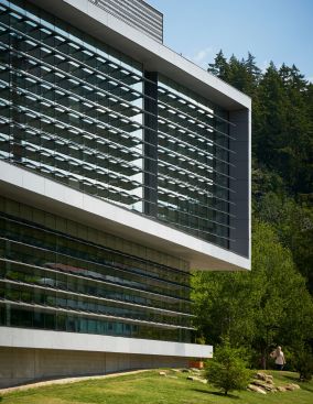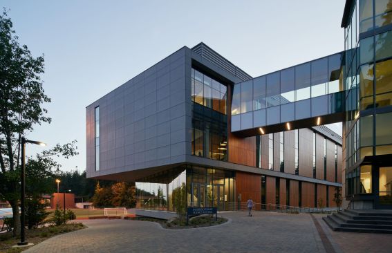 The building and site are important components of the campus ecosystem, educationally and environmentally, to connect people to place. Local ecological systems are expressed through a restored native forest, reused sandstone from the site, and a storm water feature with a vegetated site wall on the north side of the building. The trees displaced by the building were salvaged and re-used for stream restoration on the nearby Nooksack River and, in part, as seating along the pedestrian mall.