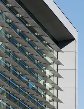 Sunshades allow natural light to reach deep into the building to collaboration zones and classrooms while also protecting from heat gain, a key design element in lowering the EUI. Within the building, the finish is clean and simple, with polished concrete floors linking a variety of learning spaces together. The green roof is a highly visual display of rainwater management and the importance of sustainability along with water channeled from the high roof to the natively planted bioswale on the north side of the building.