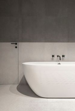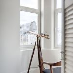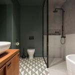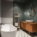 Master bathrooms have linear division into the “wet” area – portal made of the ceramic granite; and a “dry” area – painted zone. Vintage teak sideboards and towel racks stand out on a deep wall color.
