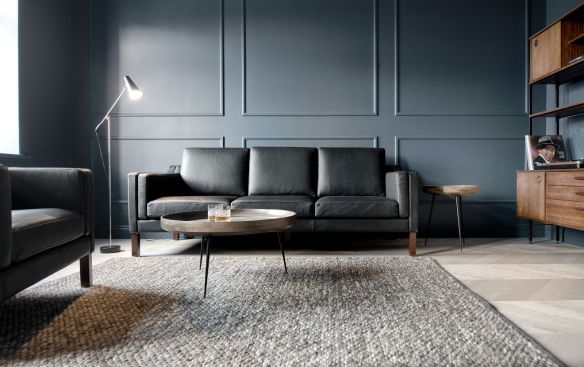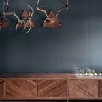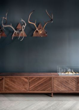 Study is painted in grey-blue color with the light grey ceiling. Due to this color separation the proportions of the room are more comfortable for perception. Vintage teak high-board and a sideboard with the bio fireplace stand out on a deep blue background.