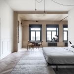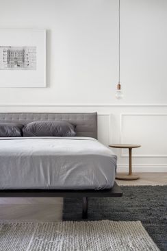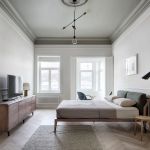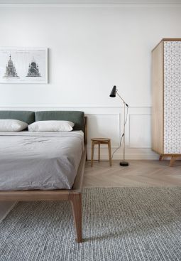 Grey-green ceiling is an accent point of the first bedroom, the color conceals the height of the room and improves the perception of the room’s proportions.