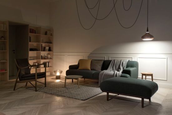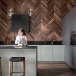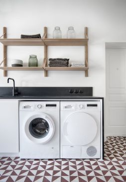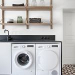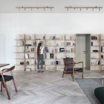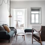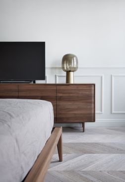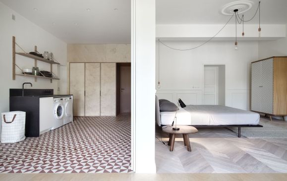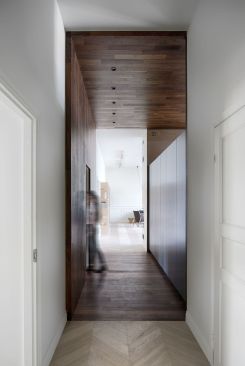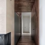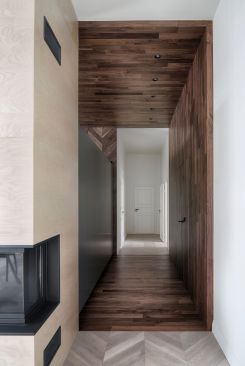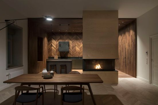 Living room is the common space. Walnut parquet visually separates a kitchen zone from the living room. Kitchen is separated from the entrance by double-sided cabinets that go not all the way to ceiling letting the natural lighting into the hall. There is a big wardrobe inside the cabinets that can be accessed from the hall; kitchen appliances and the main storage area that is accessed from the kitchen. Kitchen isle top, range hood case and kitchen top is made out of quartz stone. In the hallway the entrance to the laundry room is hidden in the walnut wall, invisible door is covered with the parquet thus giving the illusion of the undivided wall.