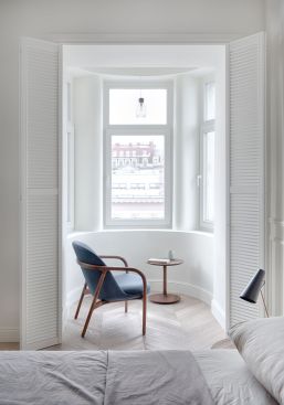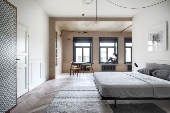 In the second bedroom division of space is done by the plywood portal. It separates the zone along the windows (breakfast area, sports equipment) from the sleeping area simultaneously letting the natural light into the room. For the isolation of the bedroom from the laundry room a sliding door is designed.