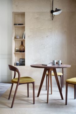 Wood burning fireplace is bespoke and was produced in Italy, finished at the site with birch plywood.
