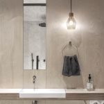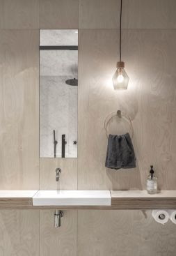 Guest bathroom is designed based on the same principal. Steam room shower is finished with marble slabs, and a “dry” zone – with birch plywood.