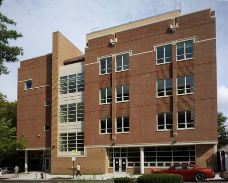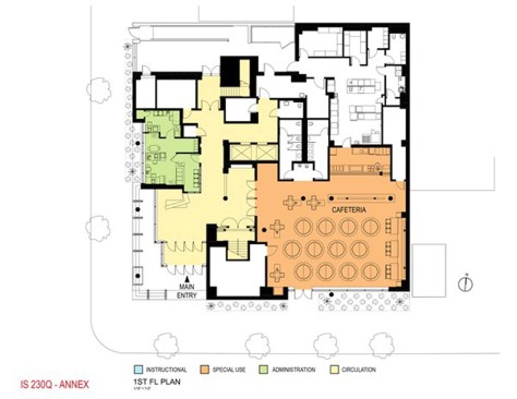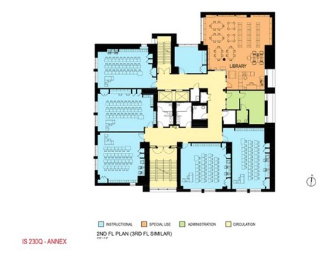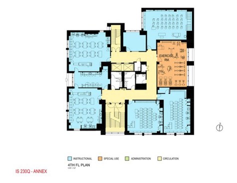 Intermediate School 230Q Annex is a four-story school constructed by the NYC School Construction Authority in the historic district of Jackson Heights in Queens. As one of the earliest neighborhoods to use innovative designs in response to the chronic scarcity of urban housing, Jackson Heights is steeped in the architectural tradition of balancing conflicting needs for efficiency and light-filled open spaces. The school layout continues this tradition by utilizing an efficient U-shaped circulation core to serve peripheral spaces. That, along with a deep setback, ensures that daylight floods the building from all sides. Exposed structural braces enhance the sense of openness within.