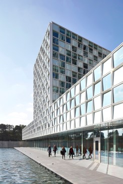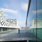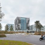 The building is designed as a sculptural abstraction, like a piece of land art, – a composition of six volumes, firmly anchored to the site and rising from the surrounding dune landscape. “It has been evident that connecting the dune landscape with the edge of the city had a striking potential. By designing a compact building with a small footprint on the old military site of the Alexander barracks, we are returning the landscape to the city,” Bjarne Hammer added.