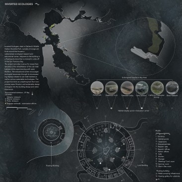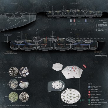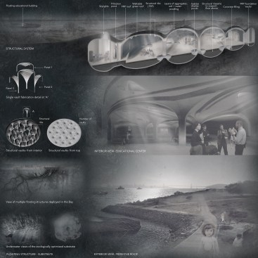 The Bay Area suffers from deteriorating water quality, which increasingly endangers marine ecologies and overall biodiversity in the region. This project is dedicated to improving water quality around the site and restoring endangered species by providing new environments in the habitat pools located in both the exterior and interior of the building. The project provides habitat pools for the restoration of a broad range of species, including Delta Smelt, Steelhead Trout, Tidewater Goby, Coho Salmon, California Freshwater Shrimp and Black Abalone. The walk-able green roof consists of filtration ponds for ocean water and grey (waste) water. The filtration ponds for ocean water mimic artificial wetlands. They consist of filtration media such as aggregate and sand beds coupled with artificial oyster and eelgrass habitats to accelerate the filtration process. The first stage of filtration pond has a combination of aggregate bed and oyster habitats since rocky beds are suitable for oyster habitats. The second stage consists of a sand bed, which serves as an ideal habitat for eelgrass. Grey water filtration ponds use a subsurface filtration system consisting of native plants such as Koeleria macrantha, Woodwardia fimbriata and Baccharis pilularis. The building minimizes its footprint by locating programs underground and providing a planted, habitable roof. The paved areas are low SRI and permeable to minimize stormwater runoff and heat island effect.