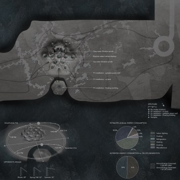In addition to the passive systems, this project relies on geothermal heating and cooling to achieve desired comfort levels. The estimated annual energy consumption is 330,801 kWh. This estimate is based on the assumption that building uses high efficient systems and LED lighting. The project uses onsite photovoltaic arrays to offset the amount of energy consumed. The proposed solar panels are adjustable and can meet optimal angles in different seasons: 28° in winter, 52° in spring and fall, and 76° in summer. The total area of PV arrays is 4,160 s.f. which is estimated to generate 321,813 kWh per annum.