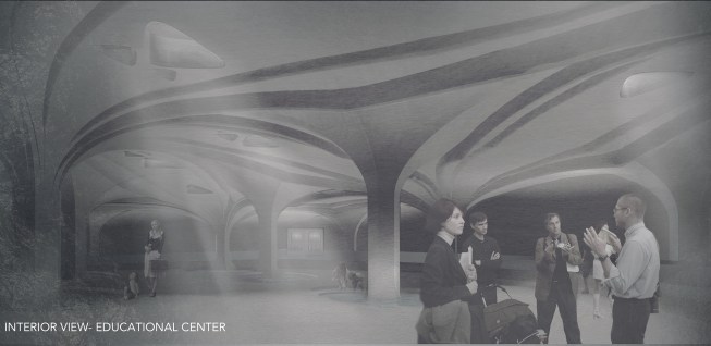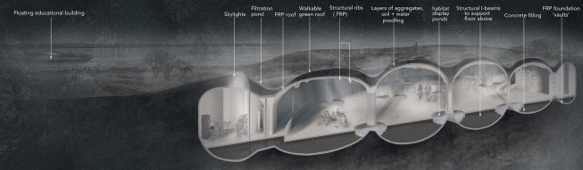 The project seeks to instill the importance of habitat restoration among the visitors to the site. In order to achieve this objective, the project access to natural habitats by locating all the program within the artificial mound. The mound, which is created by excavated earth, incorporates slopes that channel water through different filtration ponds. The building form merges with the surrounding landscape and acts as a massive water filtration system to educate visitors about their natural surroundings. The land building filters ocean water and grey (waste) water using both mechanical and natural systems ( gravity). These systems are made accessible to visitors by locating them in the public areas such as the lobby and habitable roof landscape. Water is pumped up to the roof and then migrates down through a series of filtration ponds that re-create aspects of sub-tidal ecologies such as sand and rock substrates.